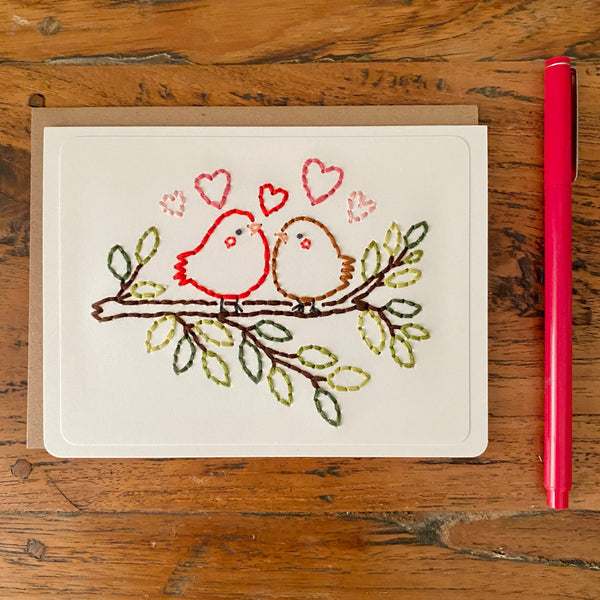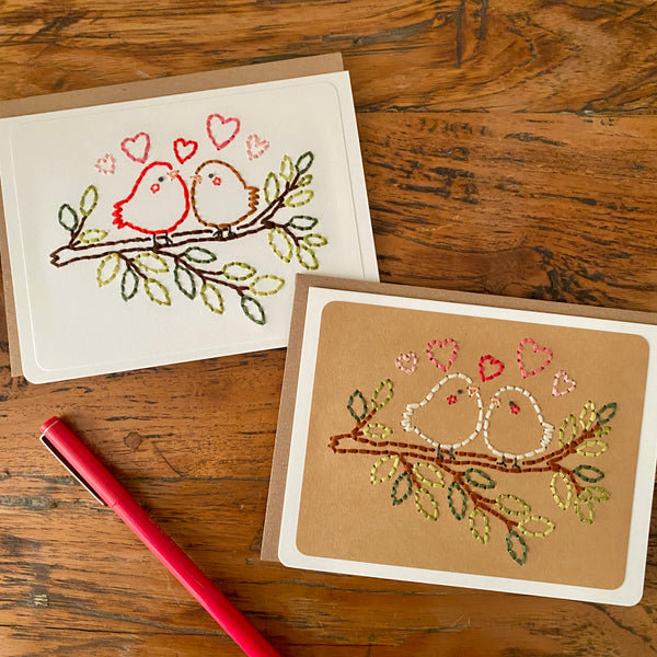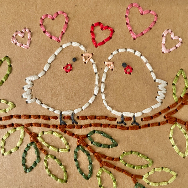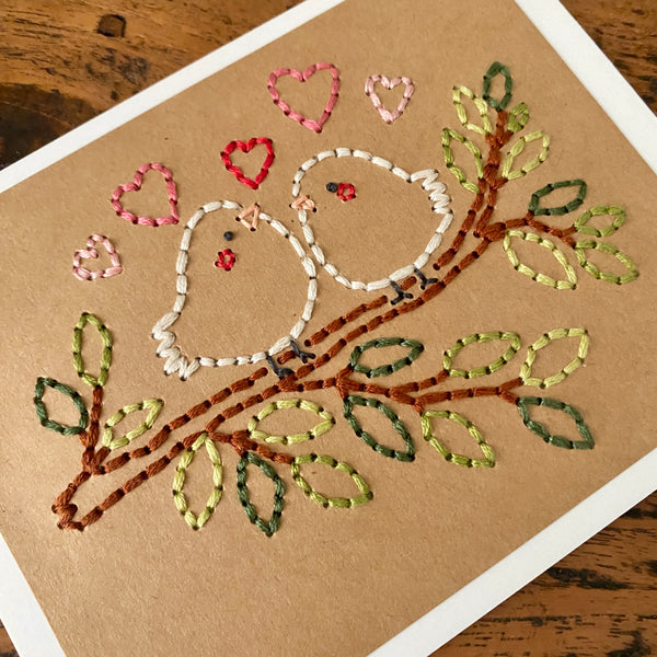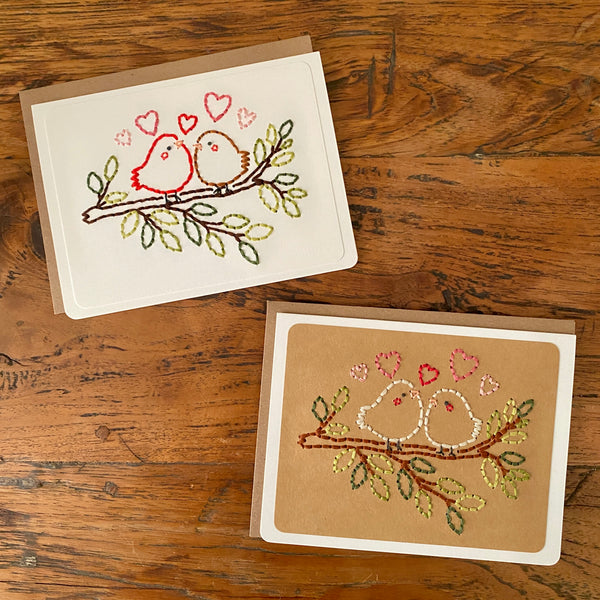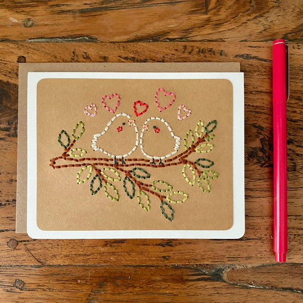 Looking for a cute Valentine's Day, anniversary, or wedding card? This keepsake hand-sewn greeting card features two sweet birds perched side by side on a tree branch with different shades of green leaves. The birds are delicately stitched with fine thread, their simple shapes and soft details giving them a warm and cozy feel. Small stitched hearts float around them, symbolizing love, friendship, and togetherness. This card has a cozy, heartfelt look that celebrates connection, making it perfect for anniversaries, weddings, Valentine’s Day, or just to say “I love you.” Choose from a white or kraft background. Each card by the Cole Card Company is carefully hand stitched and will no doubt bring a smile on the receiver's face. Hand made cards are the best!