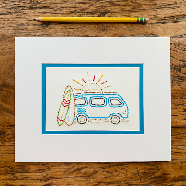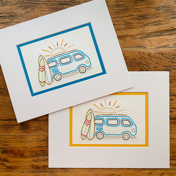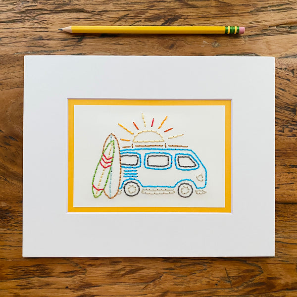 This surfer bus is carefully hand sewn onto card stock, placed behind a beveled 8x10" picture mat. Choose between a yellow or blue outline.
